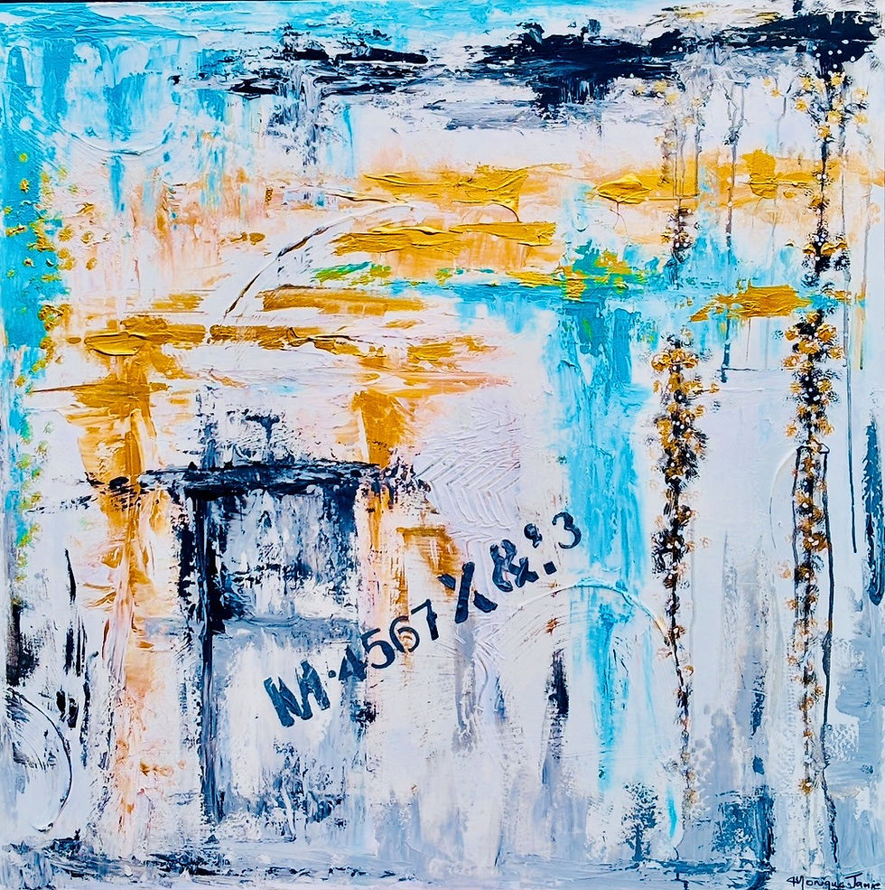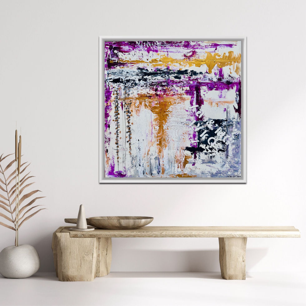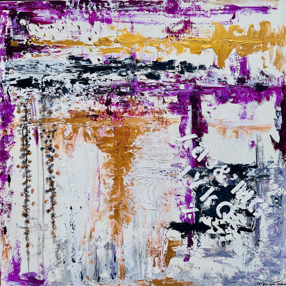 SILENT COORDINATES - this piece is an abstract journey through stillness and connection. Layers of aubergine, rich gold, and white flow together in rhythmic motion, revealing subtle traces of coded forms beneath the surface. The composition balancing warm gold tones with deep purple creating a striking focal point for any interior.